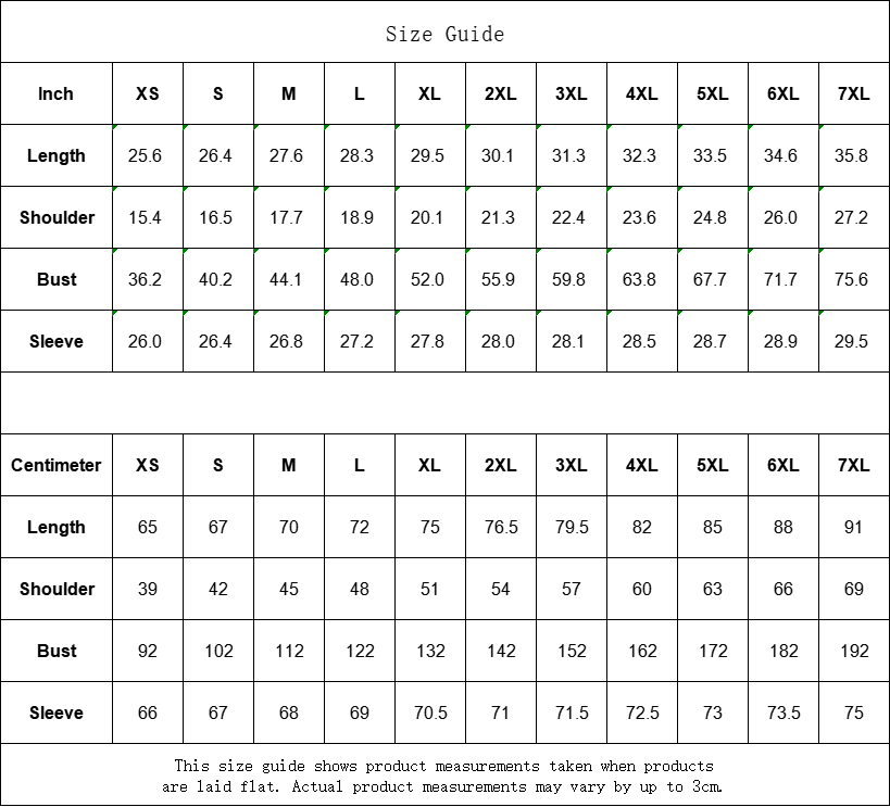 Centimeter XS S M L XL 2XL 3XL 4XL 5XL 6XL 7XL