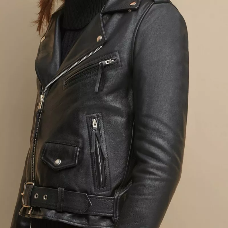 Women Biker Jacket designed shoulders and plain front zipper. Soft, decent, and stylish article stitched in leather. Manufactured by Ana fashion studio specializing in Real Leather. A jacket with quilted lining and a flexible waist belt.